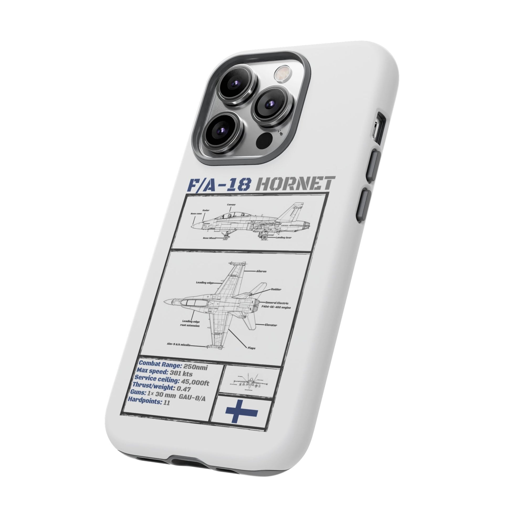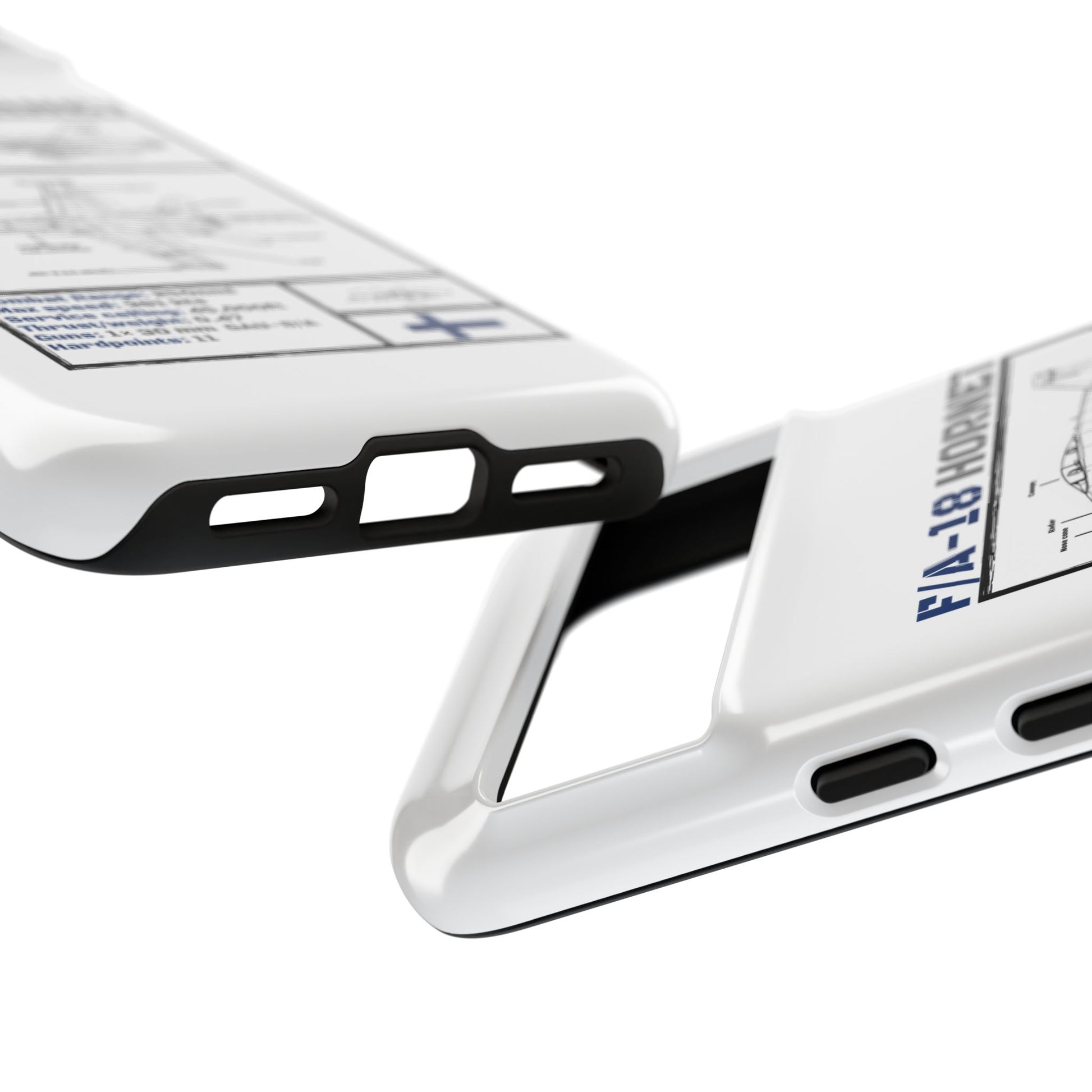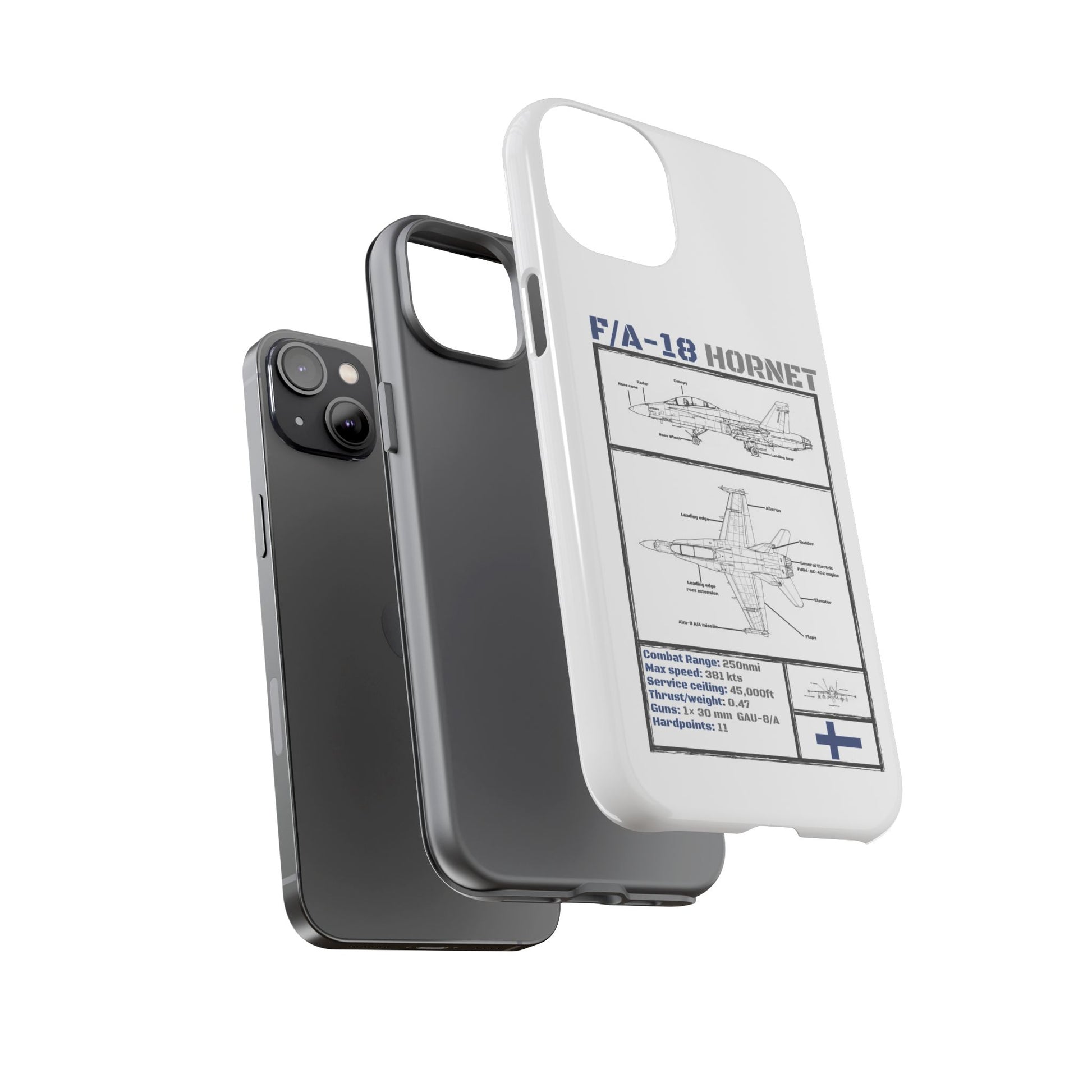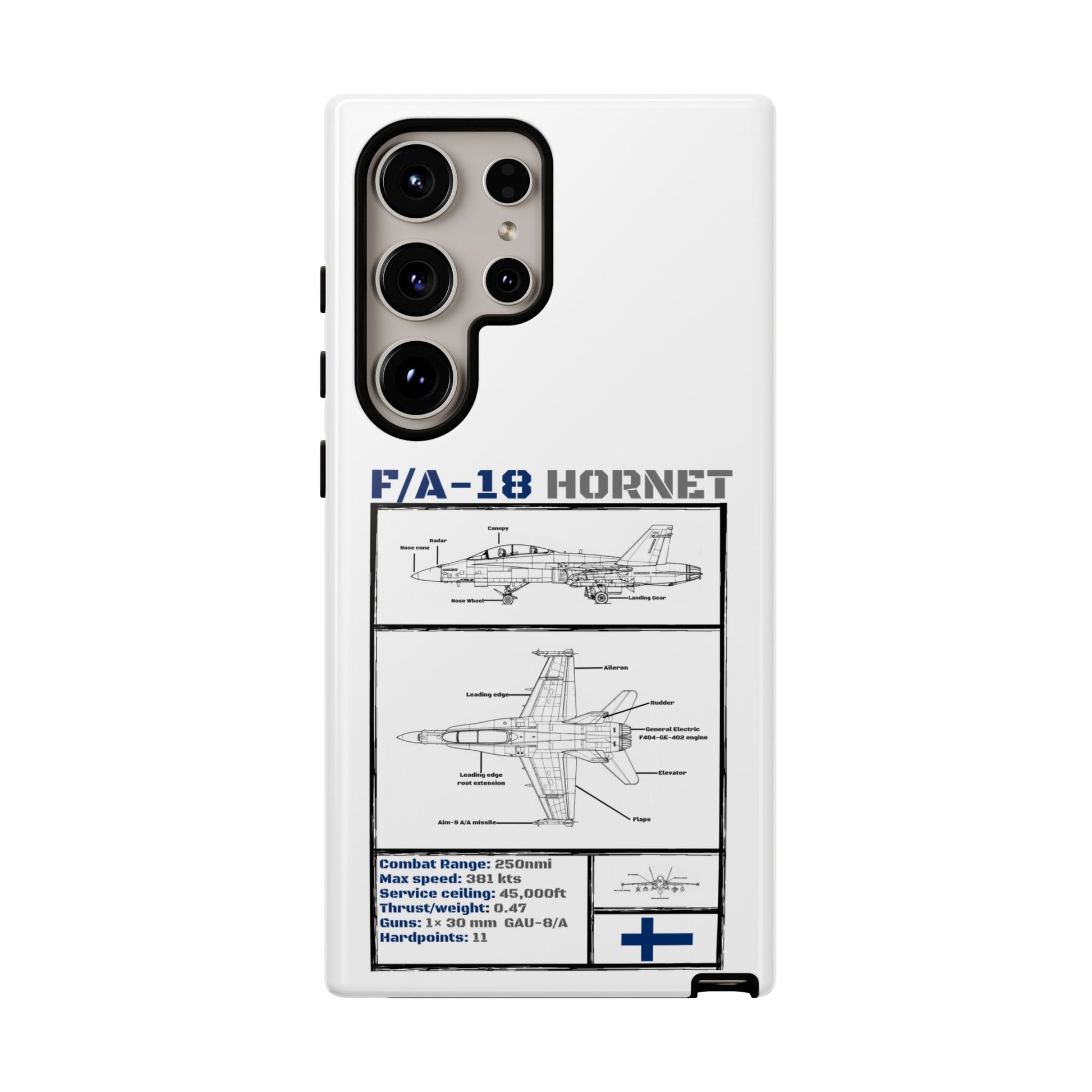 FAF Introducing the Blackbird Cases F/A-18 Schematic Edition—a sleek, high-performance phone case designed for aviation enthusiasts, by aviation enthusiasts. The detailed schematic of the iconic F/A-18 showcases its engineering brilliance, including key stats like top speed, G-limit, and max altitude.