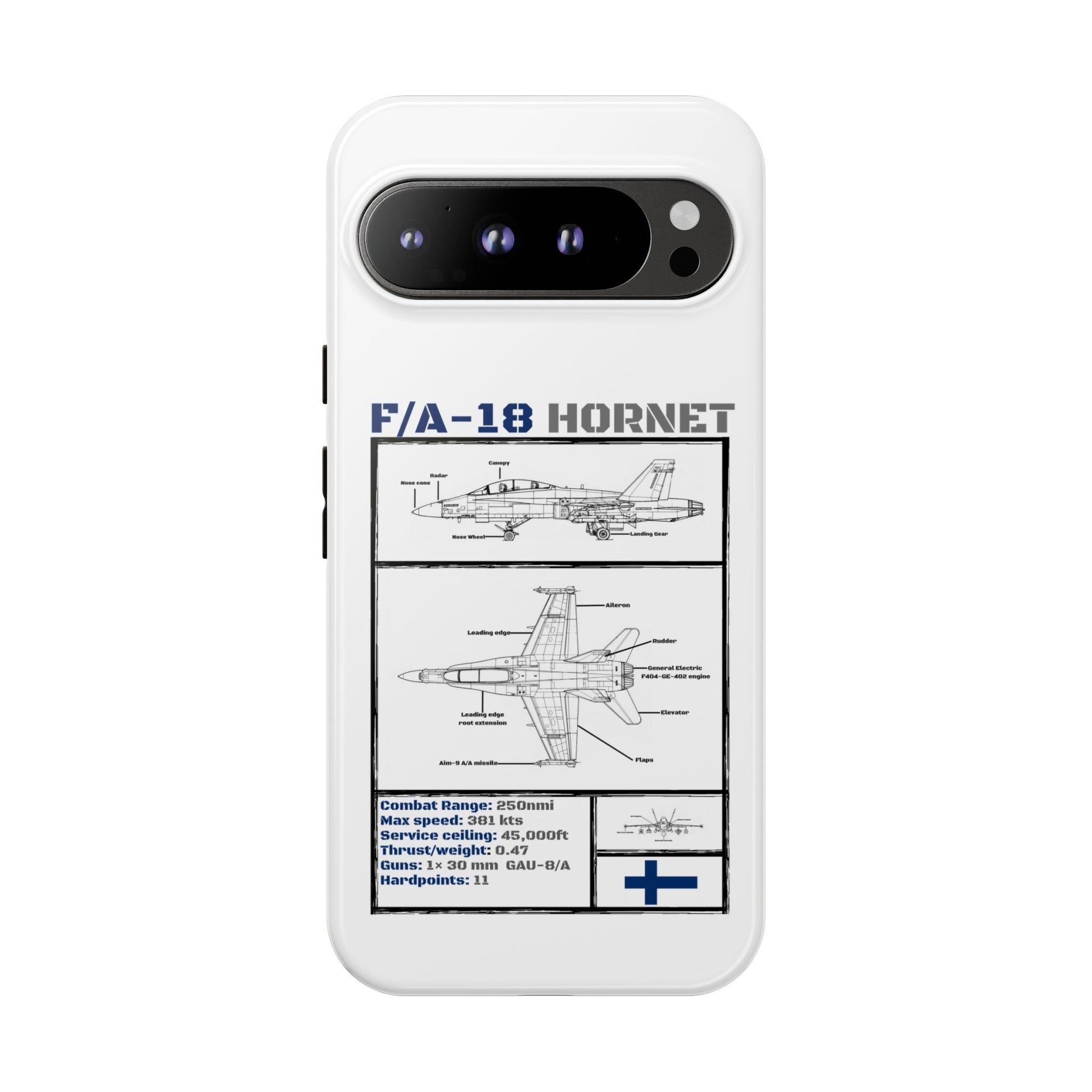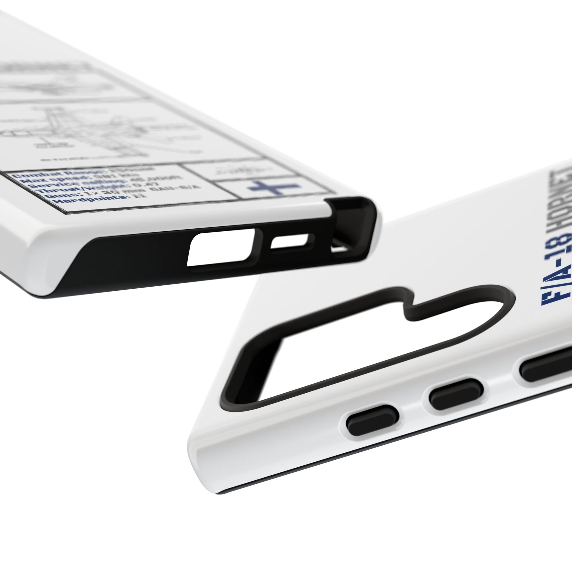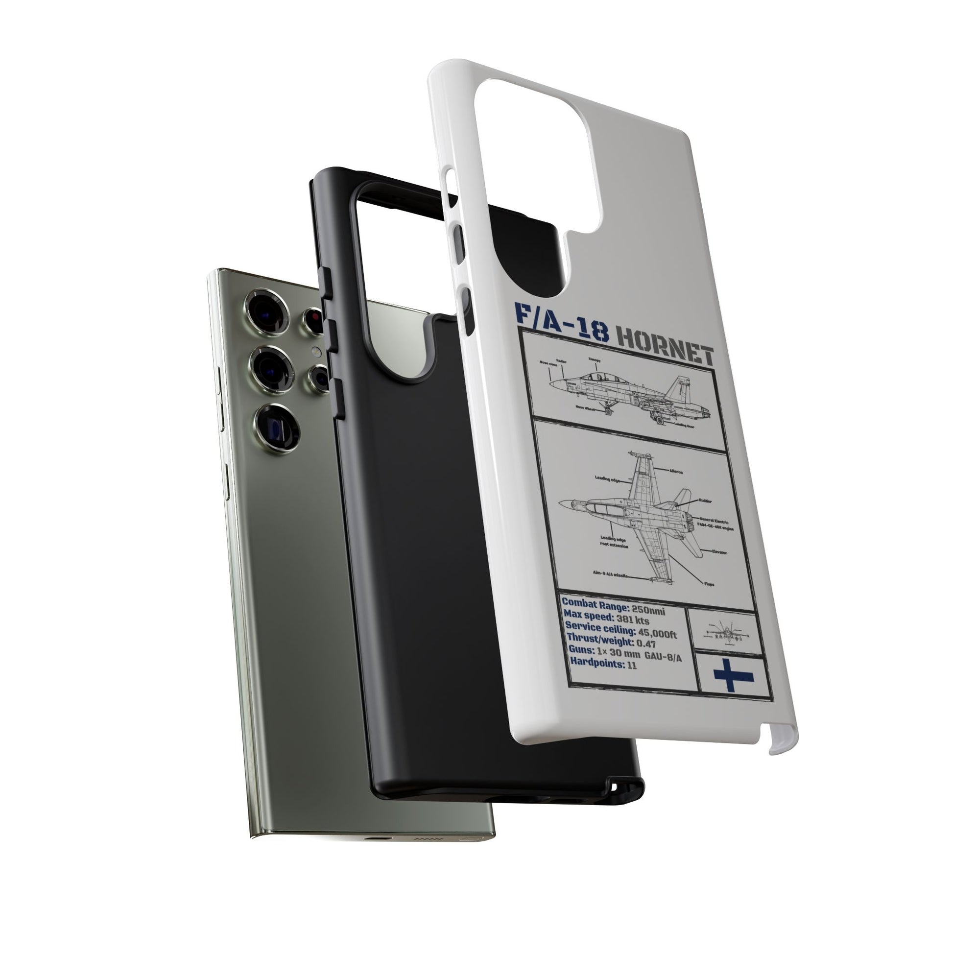 FAF Introducing the Blackbird Cases F/A-18 Schematic Edition—a sleek, high-performance phone case designed for aviation enthusiasts, by aviation enthusiasts. The detailed schematic of the iconic F/A-18 showcases its engineering brilliance, including key stats like top speed, G-limit, and max altitude.